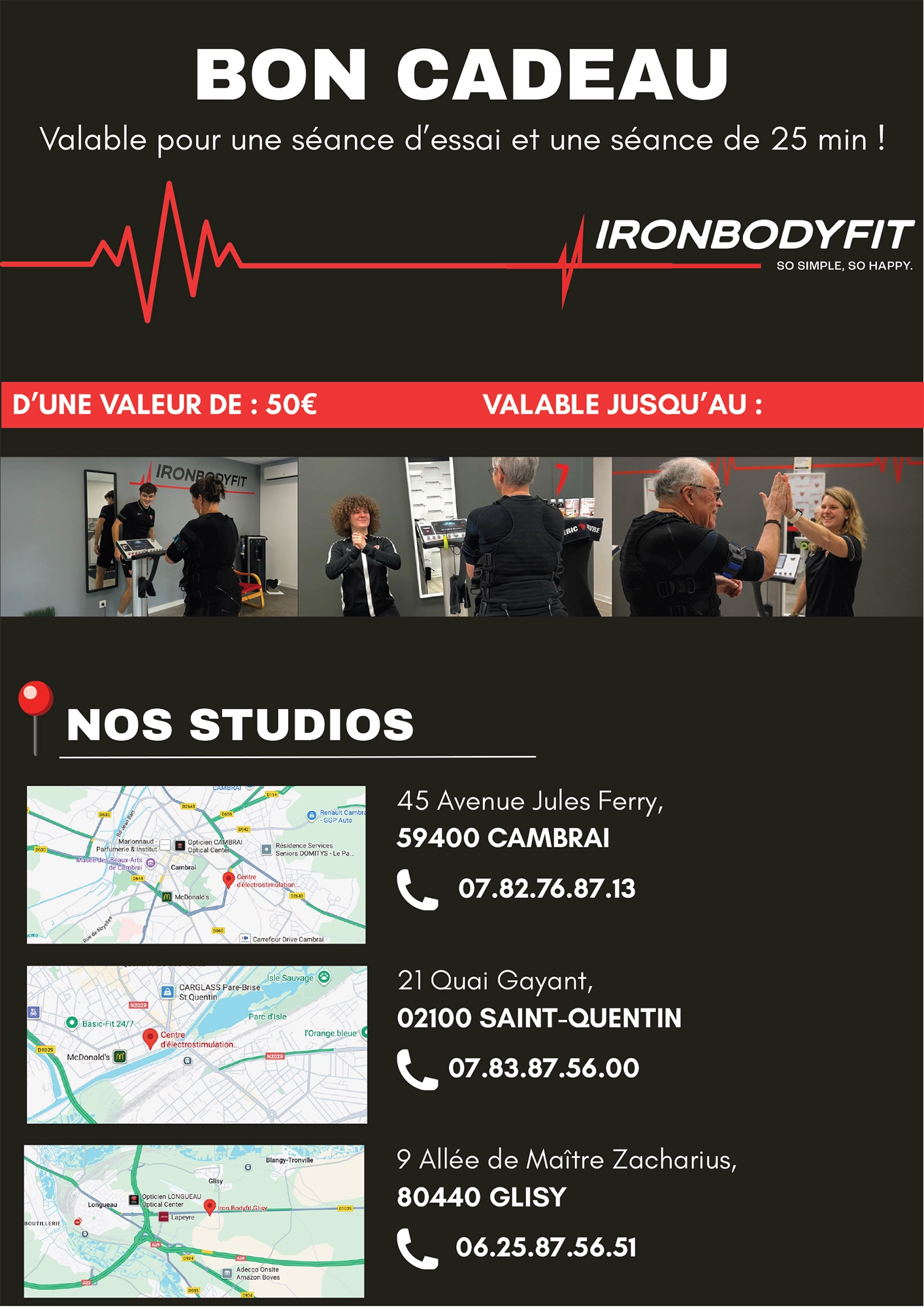 Cette offre donne accès à une séance d’essai ainsi qu’à une séance complète de 25 minutes, permettant de vivre pleinement l’expérience IronBodyfit.