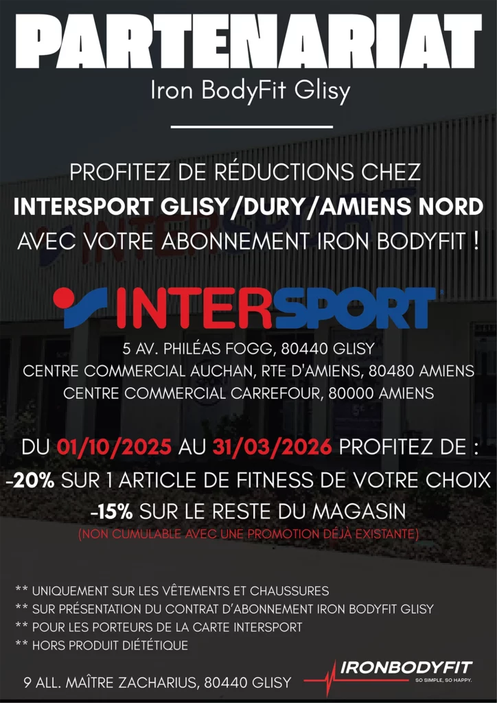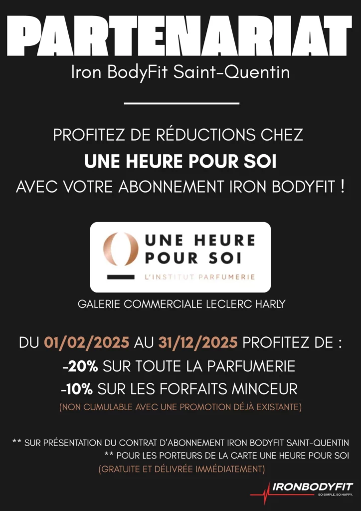 Ces collaborations permettent aux adhérents du studio de Glisy de bénéficier de réductions auprès des partenaires locaux, tout en renforçant le lien entre le studio et son environnement. Ce type d’initiative contribue à fidéliser les adhérents et à créer une expérience plus globale autour de la marque IronBodyfit.